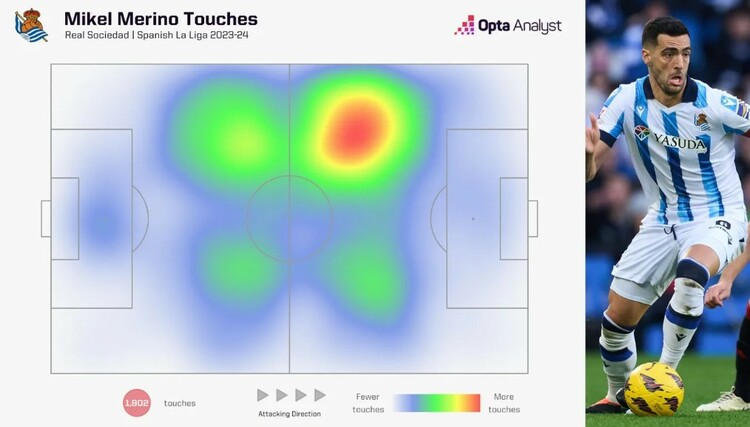 Bu1ea3n u0111u1ed3 nhiu1ec7t vu1ecb tru00ed thi u0111u1ea5u cu1ee7a Merino tu1ea1i Sociedad u1edf La Liga mu00f9a 2023-2024 vu00e0 Rice tu1ea1i Arsenal u1edf Ngou1ea1i hu1ea1ng Anh mu00f9a 2023-2024."'>