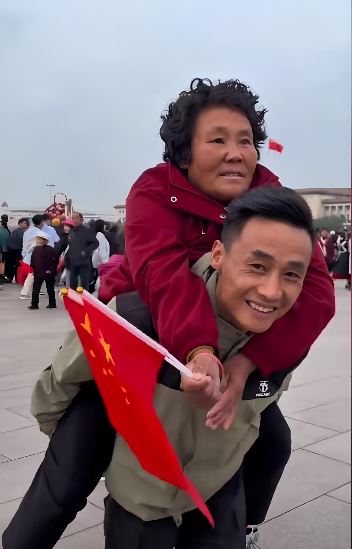 Tiểu Cương cõng mẹ xem thượng cờ ở Thiên An Môn hôm 17/10. Ảnh: Dazhong Daily