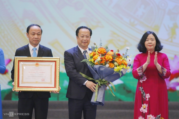 Bà Bùi Thị Minh Hoài,Bí thư Thành ủy Hà Nội,thay mặt Chủ tịch nước trao Huân chương Lao động hạng nhất cho ngành giáo dục Hà Nội,sáng 12/11. Ảnh: Thanh Hằng