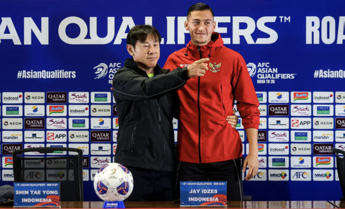 HLV Shin Tae-yong (trái) và trung vệ Jay Idzes ở họp báo ngày 14/11,trước trận Indonesia gặp Nhật Bản ở lượt năm bảng C vòng loại ba World Cup 2026 - khu vực châu Á. Ảnh: Bola