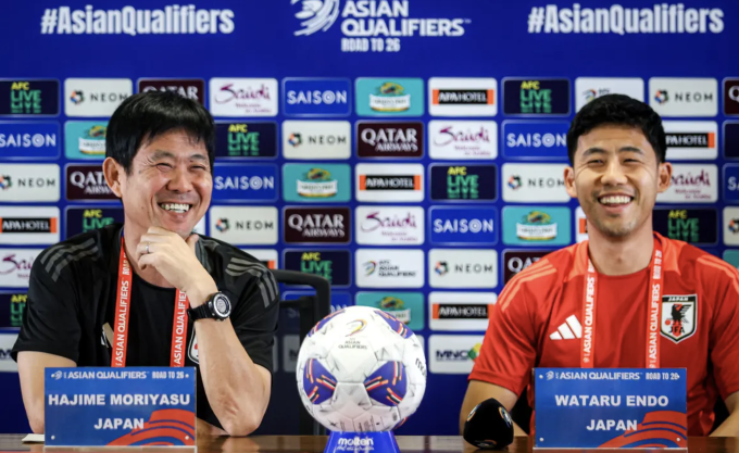 HLV Hajime Moriyasu (trái) và tiền vệ Wataru Endo ở họp báo ngày 14/11,trước trận Indonesia gặp Nhật Bản ở lượt năm bảng C vòng loại ba World Cup 2026 - khu vực châu Á. Ảnh: Bola