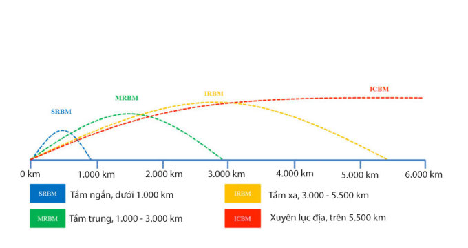 Theo Trung tâm Kiểm soát và Không phổ biến Vũ khí có trụ sở tại Mỹ,tên lửa đạn đạo được chia thành 4 loại chính,gồm tầm ngắn (SRBM) với khả năng bay dưới 1.000 km,tầm trung (MRBM) có tầm bay 1.000-3.000 km,tầm xa (IRBM) đạt tầm bắn 3.000-5.500 km và ICBM có thể đánh trúng mục tiêu ở khoảng cách trên 5.500 km.