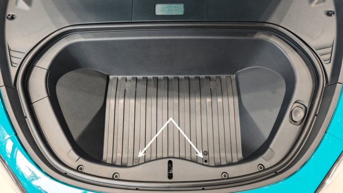 Hướng dẫn sử dụng cốp trước của Xiaomi đối với SU7,cho thấy hai lỗ thoát nước ở phần lót cao su. Ảnh: Xiaomi