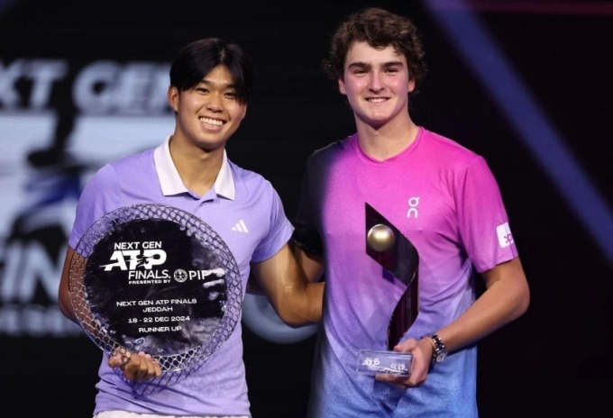 Tien (trái) và nhà vô địch Fonseca trong lễ trao giải Next Gen ATP Finals 2024 ở Jeddah,Arab Saudi. Ảnh: ATP