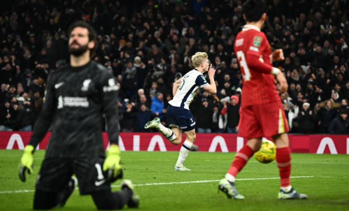 Lucas Bergvall mừng bàn duy nhất trong trận Tottenham thắng Liverpool ở lượt đi bán kết Cup Liên đoàn tối 8/1. Ảnh: Reuters