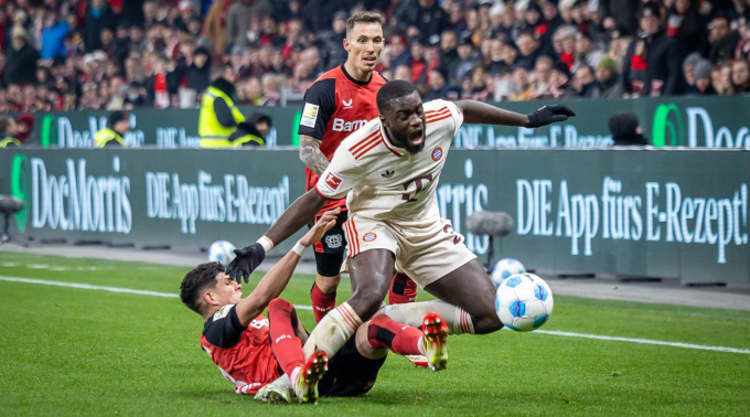 Dayot Upamecano (áo trắng) tranh chấp bóng trong trận gặp Leverkusen. Ảnh: FC Bayern