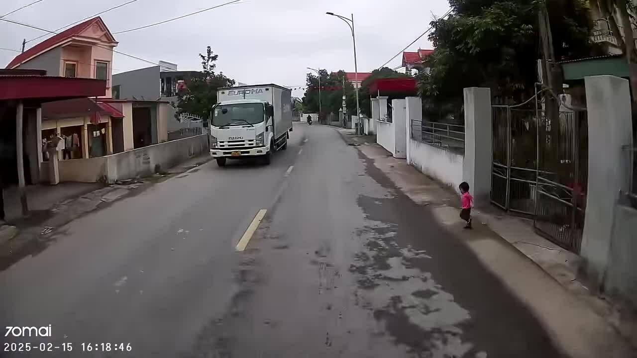 Tình huống giao thông: Em bé khoảng 3 tuổi bất ngờ từ trong nhà lao ra đường khi xe container đi tới. May mắn tài xế kịp bấm còi,em bé giật mình khựng lại,đồng thời lái xe phanh gấp tránh được một tai nạn.