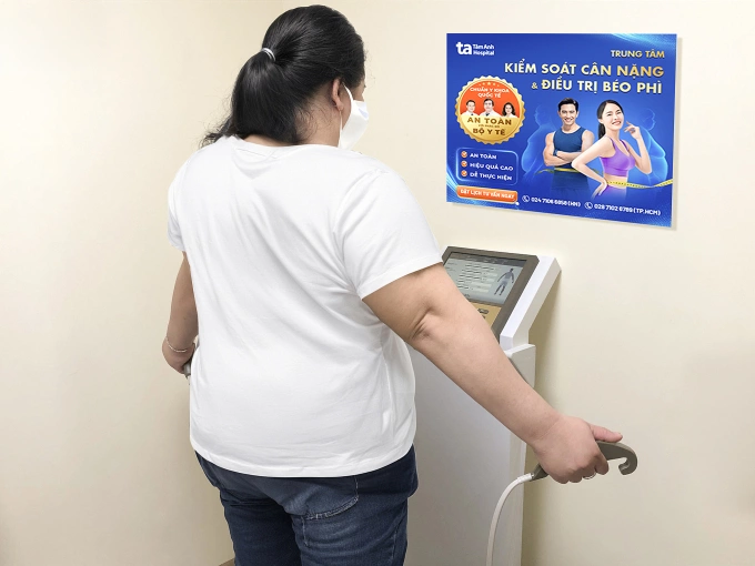 Chị Nguyệt đo bằng máy InBody để xác định các chỉ số quan trọng như BMI,mỡ nội tạng. Ảnh: Bệnh viện Đa khoa Tâm Anh