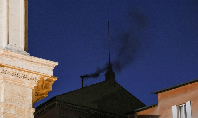 Khói đen bốc lên từ ống khói của Nhà nguyện Sistine chiều tối 7/5,báo hiệu các hồng y chưa bầu được giáo hoàng. Ảnh: Reuters