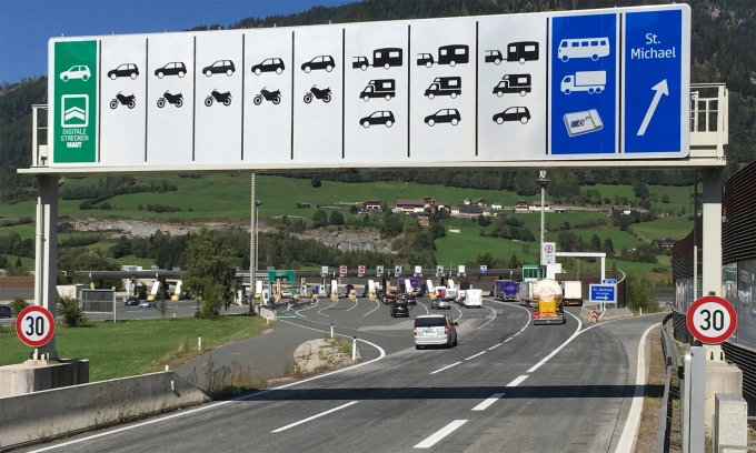 Biển báo và giới hạn tốc độ ở lối vào một trạm thu phí tại Áo,quốc gia láng giếng với Đức. Ảnh: ADAC