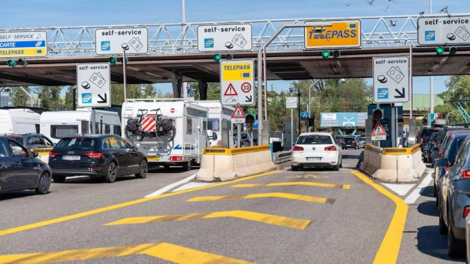 Một trạm thu phí ở hồ Garda,Italy. Tại đây,các tài xế có thể thanh toán phí bằng tiền mặt,thẻ hoặc thiết bị Telepass (làn có dấu màu vàng). Ảnh: Imago